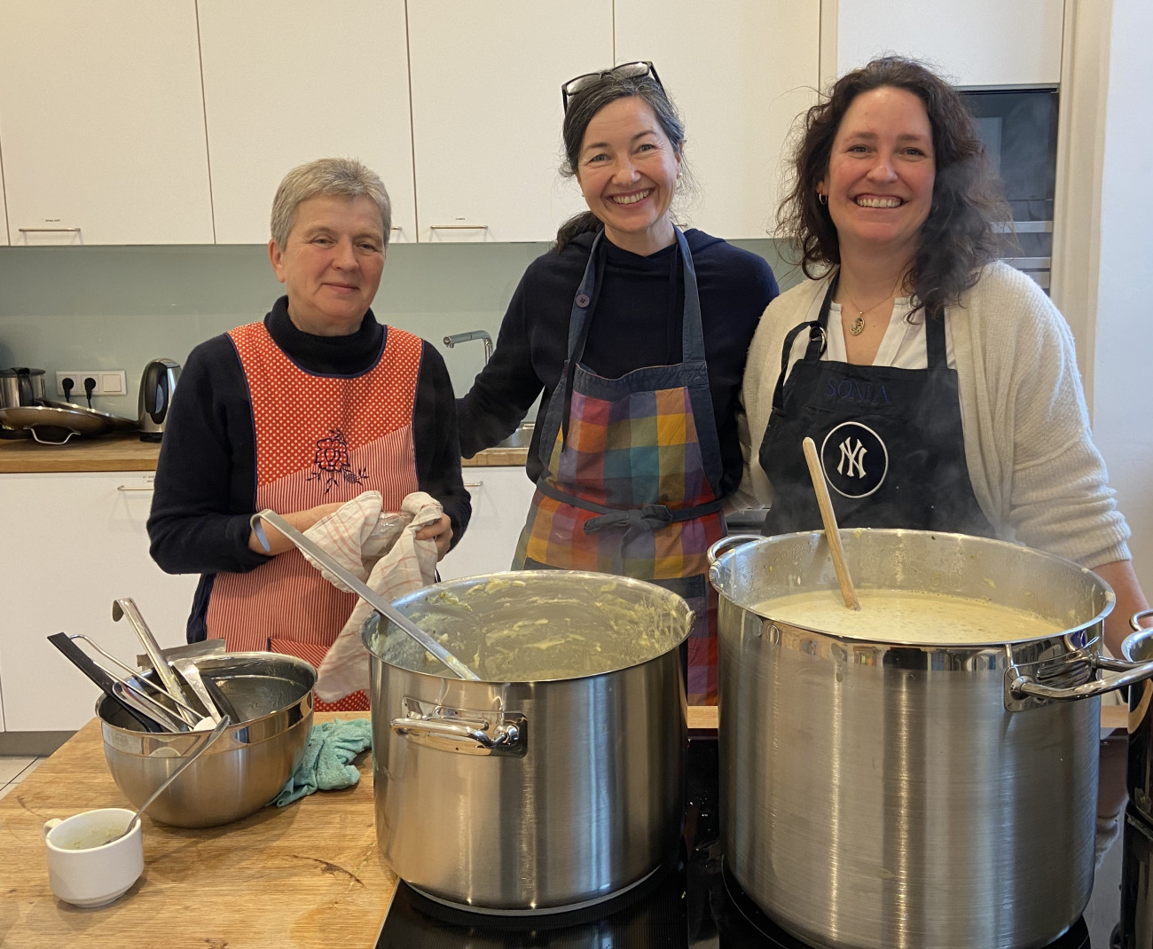drei Frauen stehen hinter Töpfen in einer Küche und lächeln