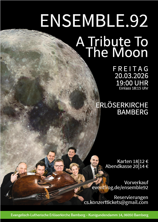 Träumende, Mondsüchtige, Glühwürmchen, Fledermäuse, Werwölfe, Vampire und alle anderen Nachtschwärmer sind am 20. März 2026 um 19 Uhr zu einem besonderen Konzerterlebnis in die Erlöserkirche eingeladen. Zwischen Vollmond und Neumond im März entfaltet sich ein musikalisch-literarischer Abend rund um den Mond. Lieder von Schubert, Weill, Fitzgerald und Sting begegnen Texten von Joseph von Eichendorff, Kurt Tucholsky und Robert Gernhardt.